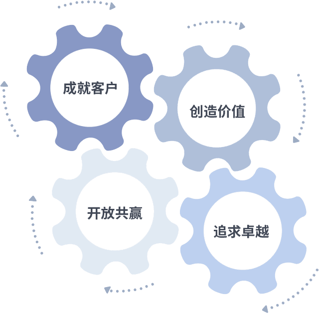 成就客户是一切决策的出发点,,,,创造价值是衡量所有工作的标准,,,追求卓越是BBIN·宝盈集团做事做人的态度,,,,开放共赢是BBIN·宝盈集团的格局也是最终的结果。。。。价值观的齿轮环环相扣,,推动着组织里的每个人不断向前。。
